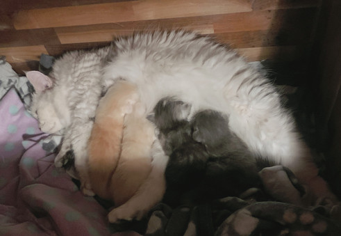 Noch genießen sie die Nähe zu Phibi, die ihre Mutterrolle wie gewohnt mit Liebe und Hingabe erfüllt. Kein Schnurrhaar bleibt ungesäubert, und jede zarte Bewegung wird von ihr mit größter Fürsorge begleitet. Bald werden die kleinen Abenteurer ihre ersten Schritte aus der kuscheligen Wurfkiste wagen – wir können es kaum erwarten, ihre Persönlichkeiten besser kennenzulernen.